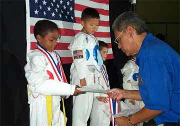![]() ...then delivers silver medalist Grant L. his certificate. |